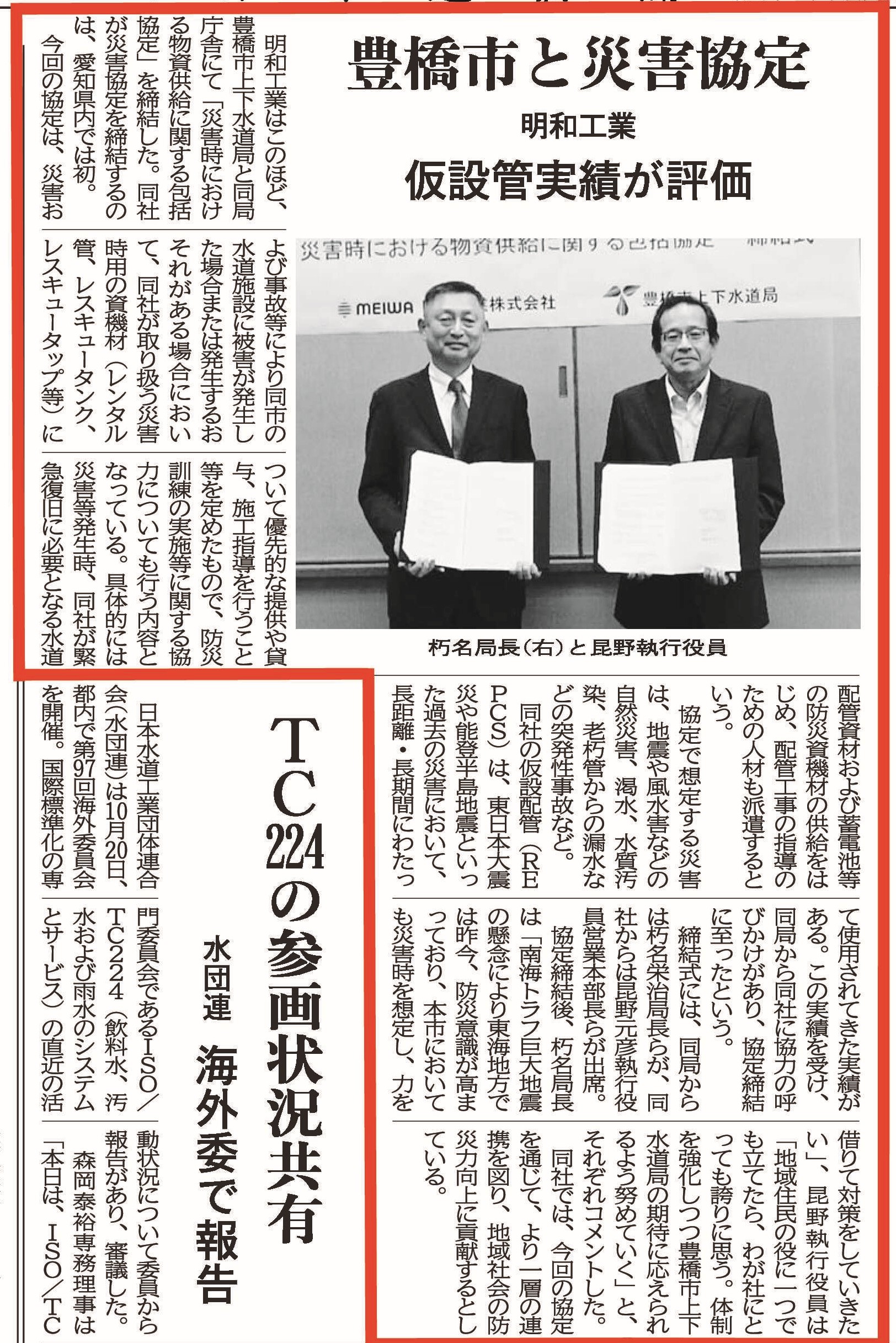 2025年10月27日付の『水道産業新聞』および11月20日付の『日本水道新聞』に、明和工業株式会社と愛知県・豊橋市上下水道局様との間で締結した「災害時における物資供給に関する包括協定」についての記事が掲載されました。
