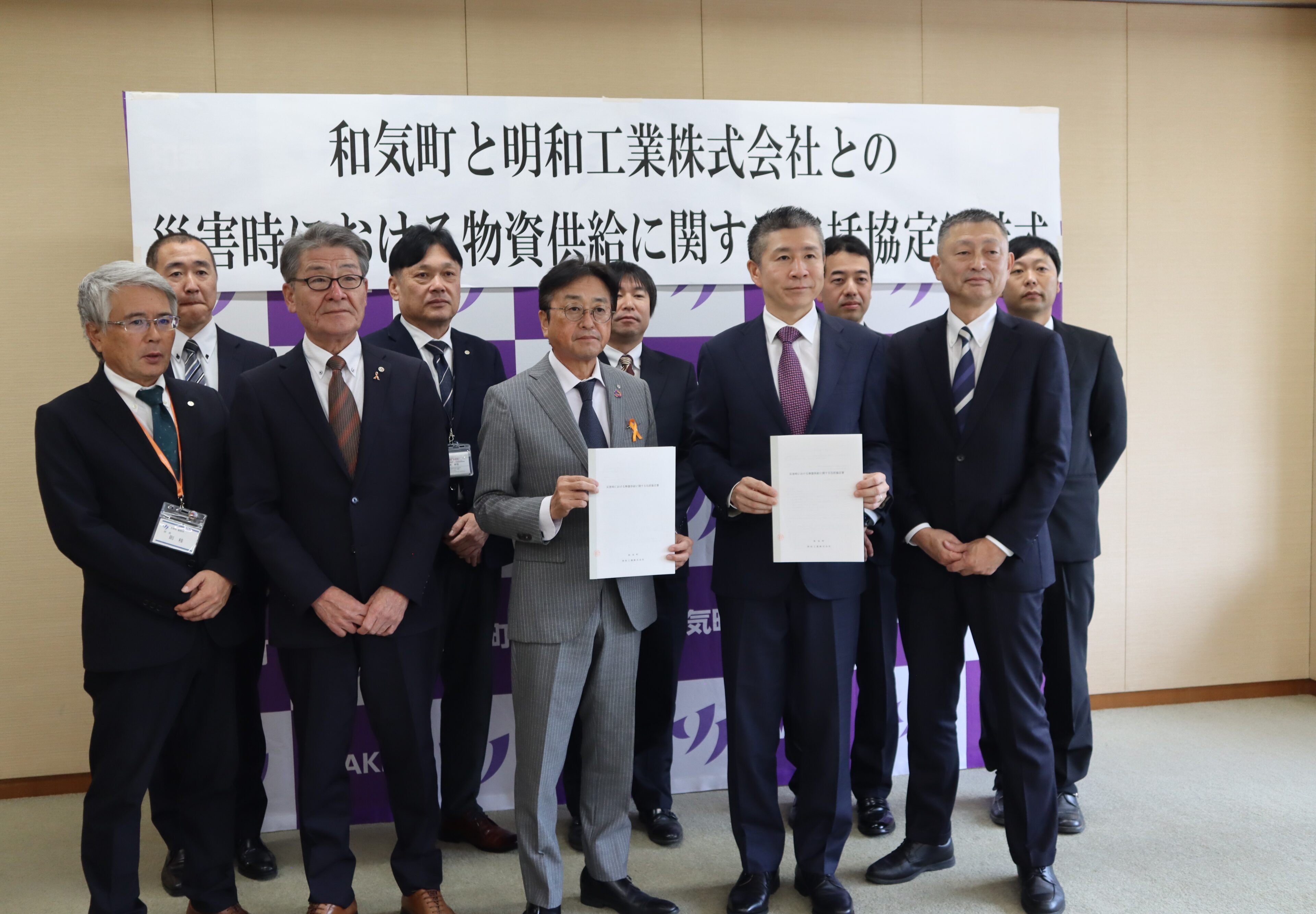 明和工業株式会社は11月18日(火)、岡山県和気町と「災害時における物資供給に関する包括協定」を締結しました。