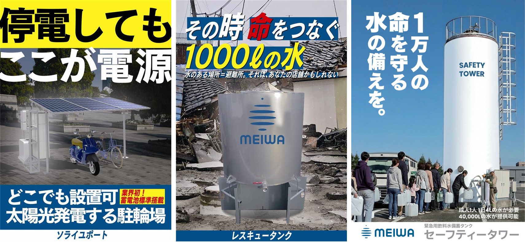 本展示会では、太陽光発電・蓄電機能を備え、災害時のBCP対策や平時の電力活用にも対応するソーラーサイクルポート「ソライユポート」をはじめ、災害発生時に約1トンの生活用水を確保できる給水タンク「レスキュータンク」など、命をつなぐ「電気と水」を守る防災製品を紹介いたします。